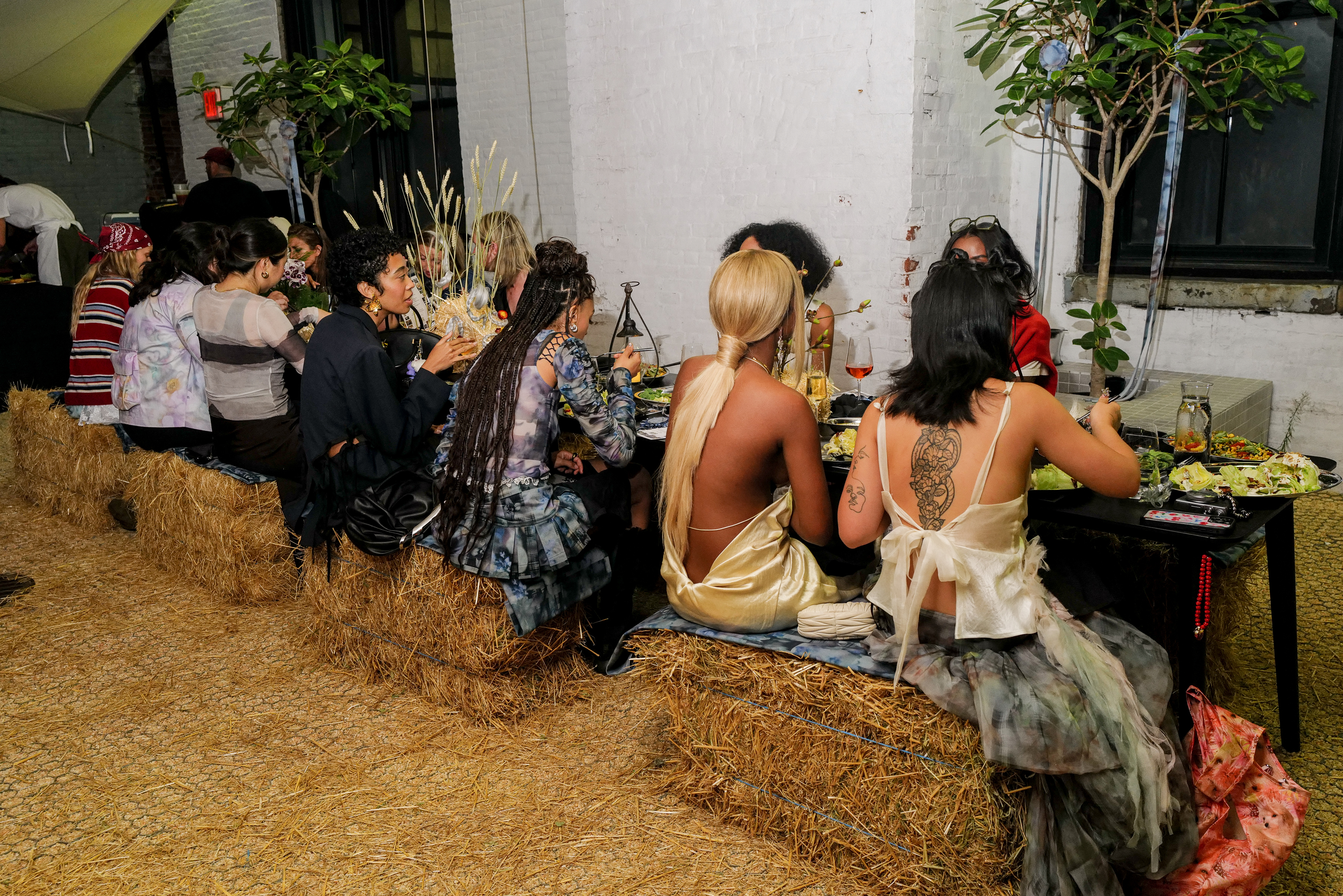 The vegan barbeque spread by Pierce Abernathy dinner was a true representation of both brands. Touchpoints throughout the venue included a custom hay bale set incorporating the shoes from the collection, brand logos and a miniature pony, leaning into Collina Strada’s “horse girl” iconography.